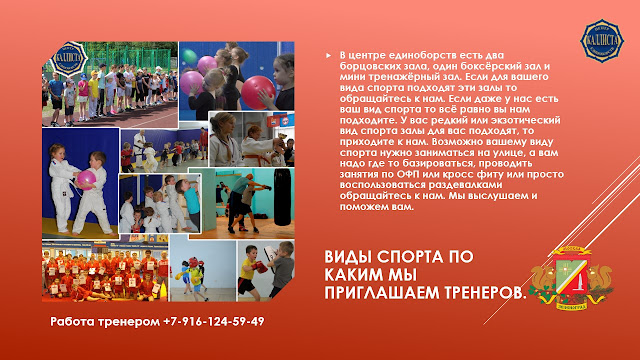 В центре единоборств есть два борцовских зала, один боксёрский зал и мини тренажёрный зал. Если для вашего вида спорта подходят эти залы то обращайтесь к нам. Если даже у нас есть ваш вид спорта то всё равно вы нам подходите. У вас редкий или экзотический вид спорта залы для вас подходят, то приходите к нам. Возможно вашему виду спорта нужно заниматься на улице, а вам надо где то базироваться, проводить занятия по ОФП или кросс фиту или просто воспользоваться раздевалками обращайтесь к нам. Мы выслушаем и поможем вам.